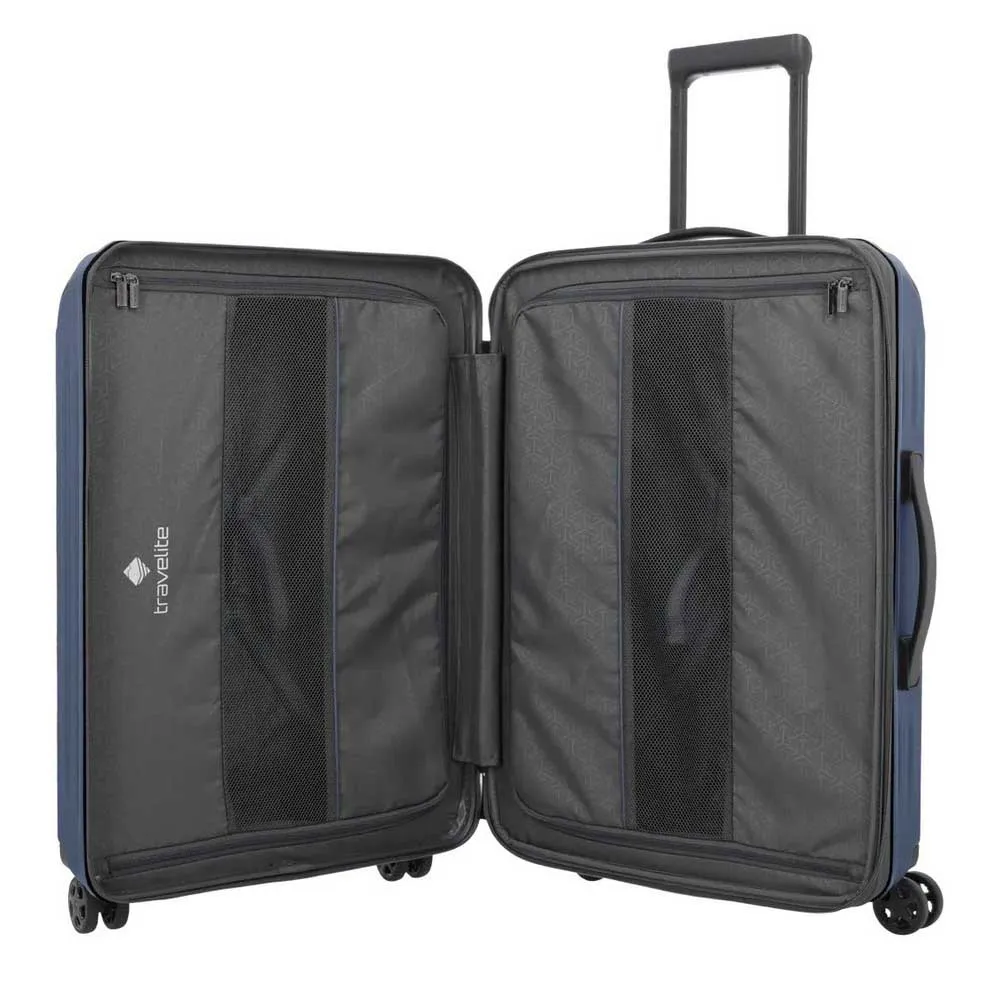 Extend your trip on a whim with the TRAVELITE Dynamiic trolley. A practical expansion fold instantly increases your packing space from 69 to 79 liters. Your luggage arrives safe and sound thanks to a shatterproof ABS shell, reinforced corner protection, and a scratch-resistant surface. Travel with confidence using the integrated TSA lock for security. Glide effortlessly on four smooth double castors, guided by a sturdy telescopic handle. The organized interior, featuring dividers and a lining from recycled materials, makes packing a breeze for any stylish traveler