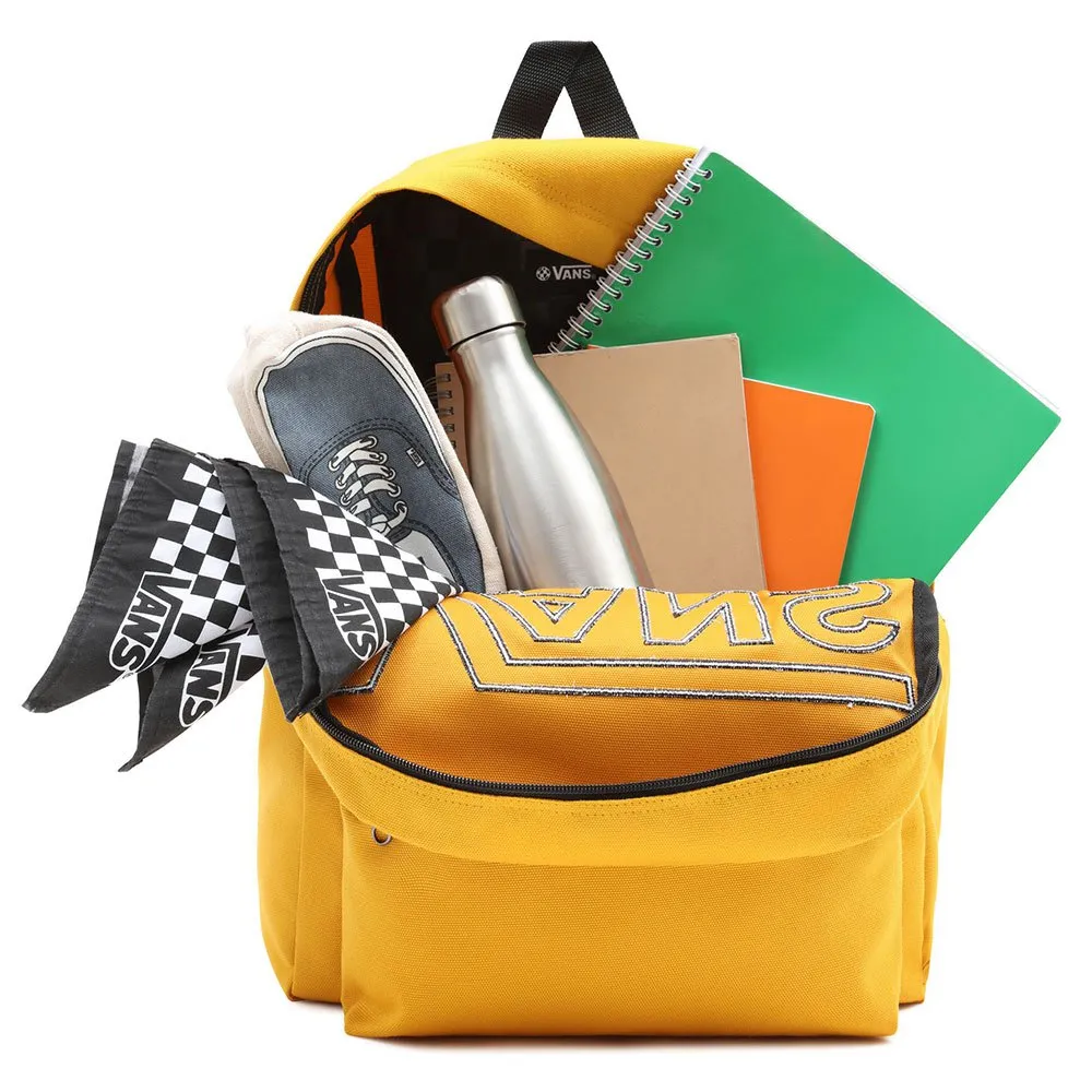 The Vans Old Skool Drop V Backpack features one large main compartment, a front zip pocket with an organiser for quick access, and a water bottle pocket. It has padded shoulder straps for extra comfort, the Vans logo on the front.