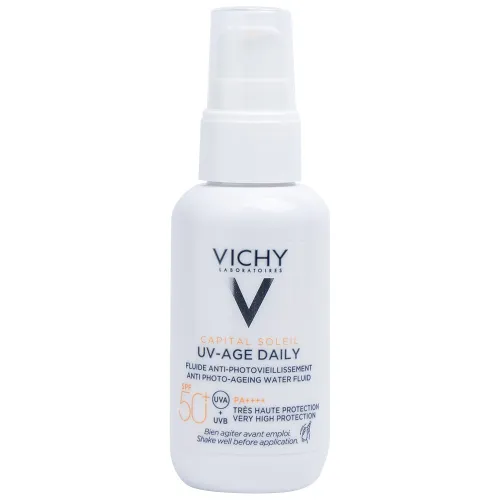 Shield your skin from premature aging and sun damage with Vichy UV Age Daily SPF 50 Sunscreen. This advanced, daily-use sunscreen provides broad-spectrum protection against UVA and UVB rays, helping to prevent wrinkles, dark spots, and other signs of photoaging. Ideal for normal skin, its lightweight, non-greasy formula absorbs quickly without leaving a white cast, making it the perfect base for makeup.