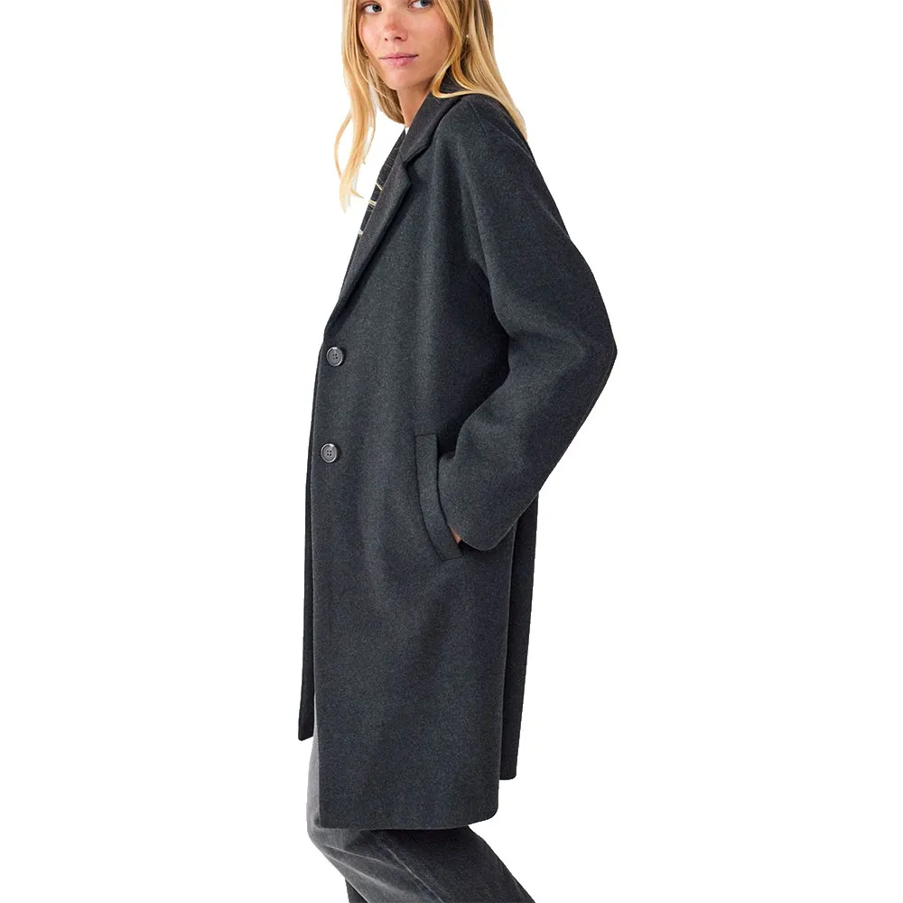 Abrigo largo con corte clásico, mangas largas, cierre central con botones y bolsillos laterales.