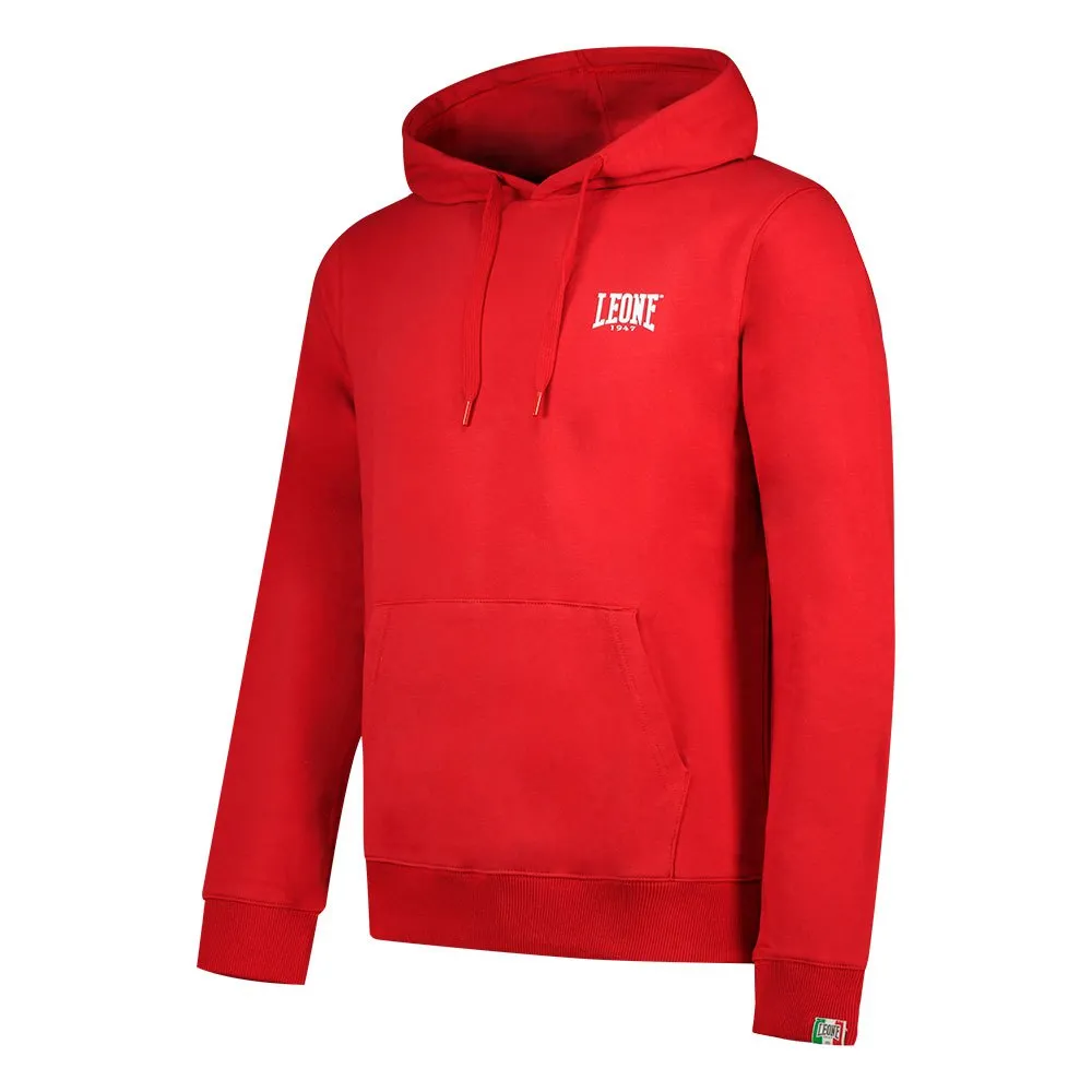 Sudadera con capucha para hombre de Leone 1947 Apparel Línea Basic con pequeño logo, versátil y funcional, apta para deporte y tiempo libre. Confeccionada en felpa invernal cepillada, 100% algodón. Presenta detalles sencillos y funcionales: ribete elástico en el bajo y puños, cordón de algodón, gran bolsillo canguro, pequeño logo Leone 1947 impreso en el bolsillo y etiqueta tejida en el puño. Las etiquetas tejidas están cocidas en el interior de la prenda.