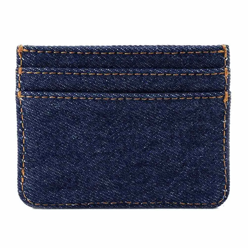 Este tarjetero de mezclilla lavado fue diseñado para guardar todas tus tarjetas de forma segura y fue confeccionado con mezclilla clásica.
