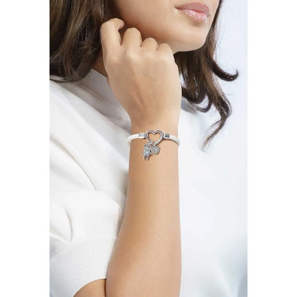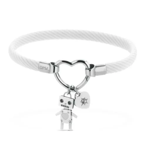 Pulsera personalizada de silicona y acero con grabado OPS. Cierre de mosquetón en forma de corazón, con colgante en forma de corazón con cristal y robot. Tratamiento PVD en oro rosa. Circunferencia interna 58×48 mm. Pulsera de silicona y acero con cierre de corazón con colgante en forma de robot.
