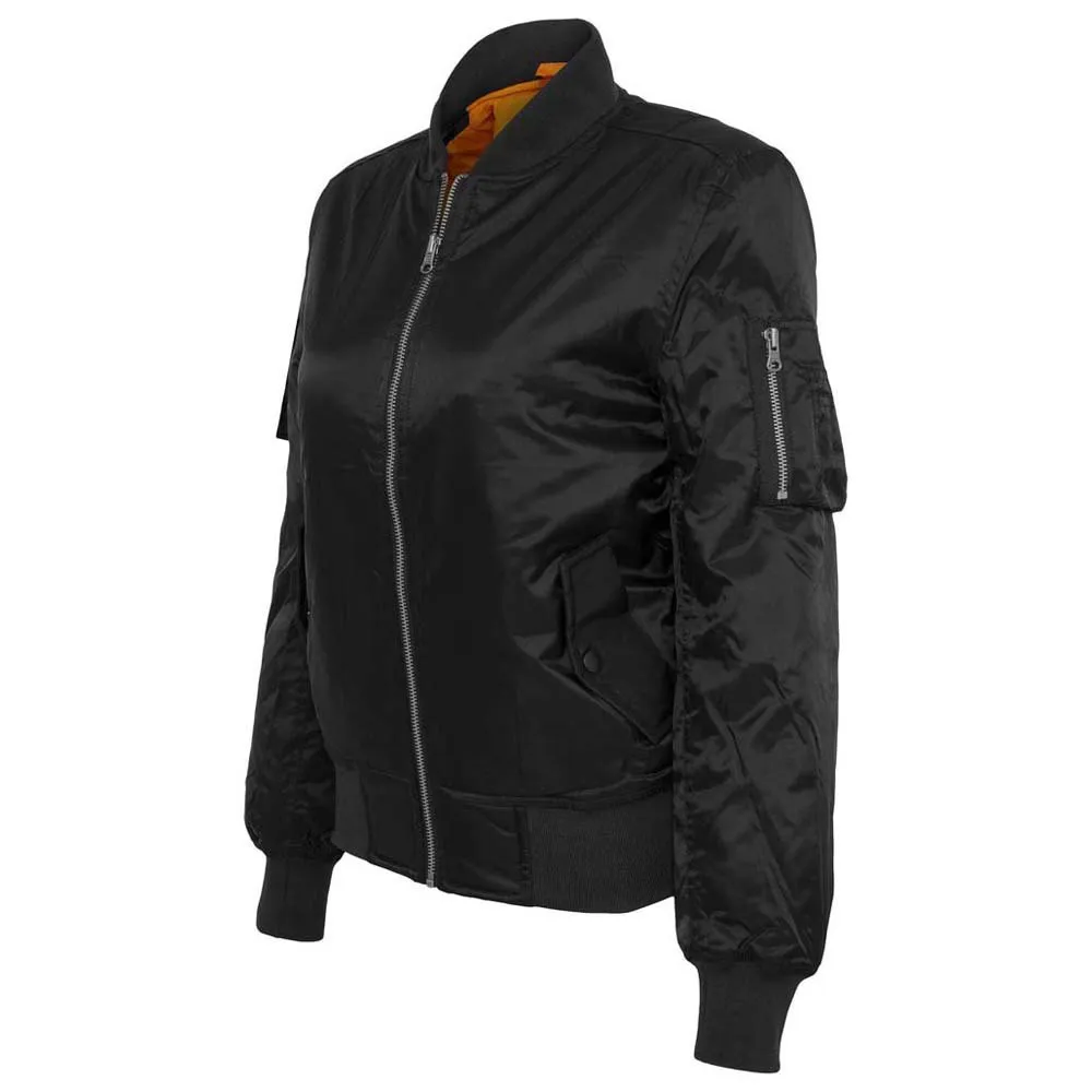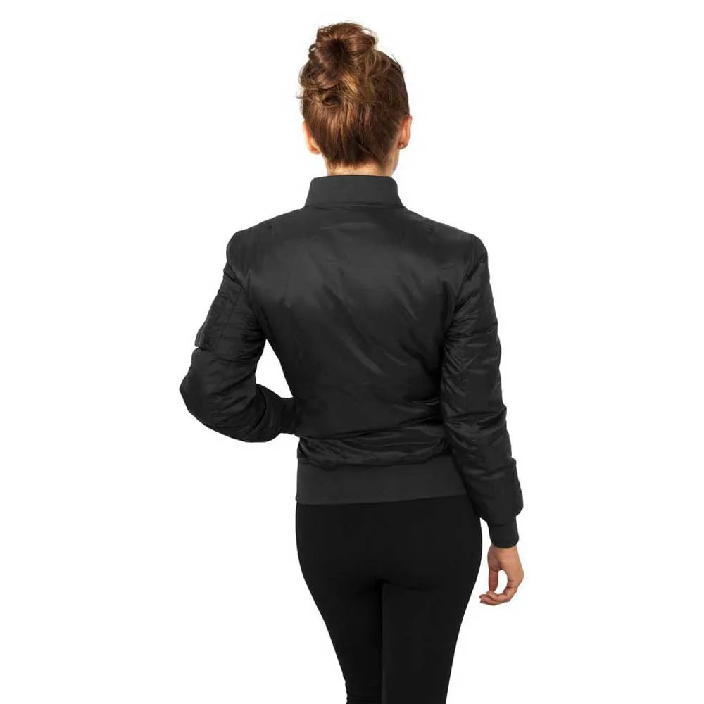 La Ladies Basic Bomber Jacket de Urban Classics convence con el bolsillo con cremallera en la parte superior del brazo izquierdo y el forro interior en naranja. Hay un bolsillo en el lado derecho e izquierdo del frente.