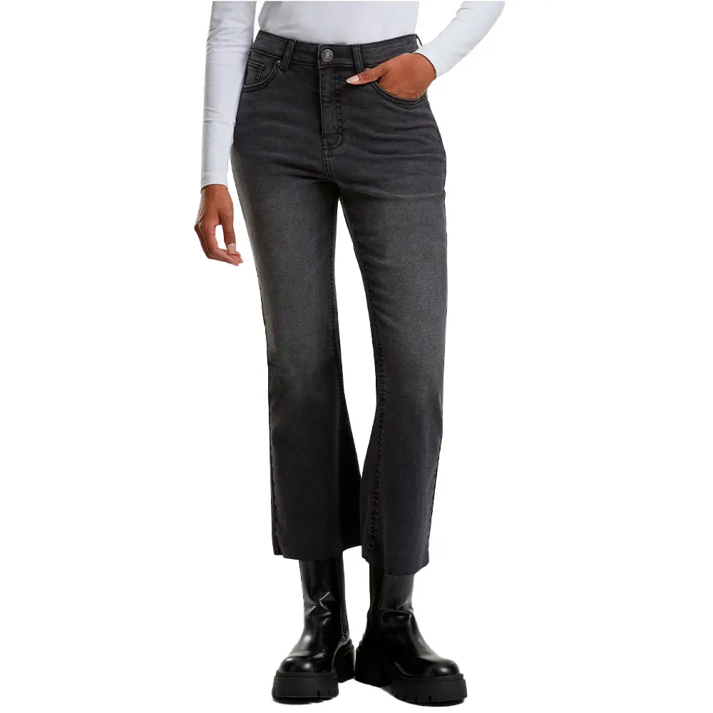 El principal beneficio de estos jeans acampanados reside en su corte único y favorecedor. La silueta está diseñada para ajustarse a las caderas y los muslos, ensanchándose elegantemente desde la rodilla hasta un dobladillo corto y elegante. Este diseño de pantalón largo crea una hermosa sensación de movimiento y ayuda a alargar visualmente las piernas, ofreciendo un perfil equilibrado y dinámico. El largo cropped es un toque moderno que permite lucir tu calzado favorito, ya sea que los combines con zapatillas deportivas gruesas, botines elegantes o tacones sofisticados. Esta versatilidad los convierte en una opción ideal para pasar de un look casual de día a un conjunto de noche más pulido.