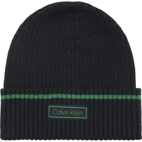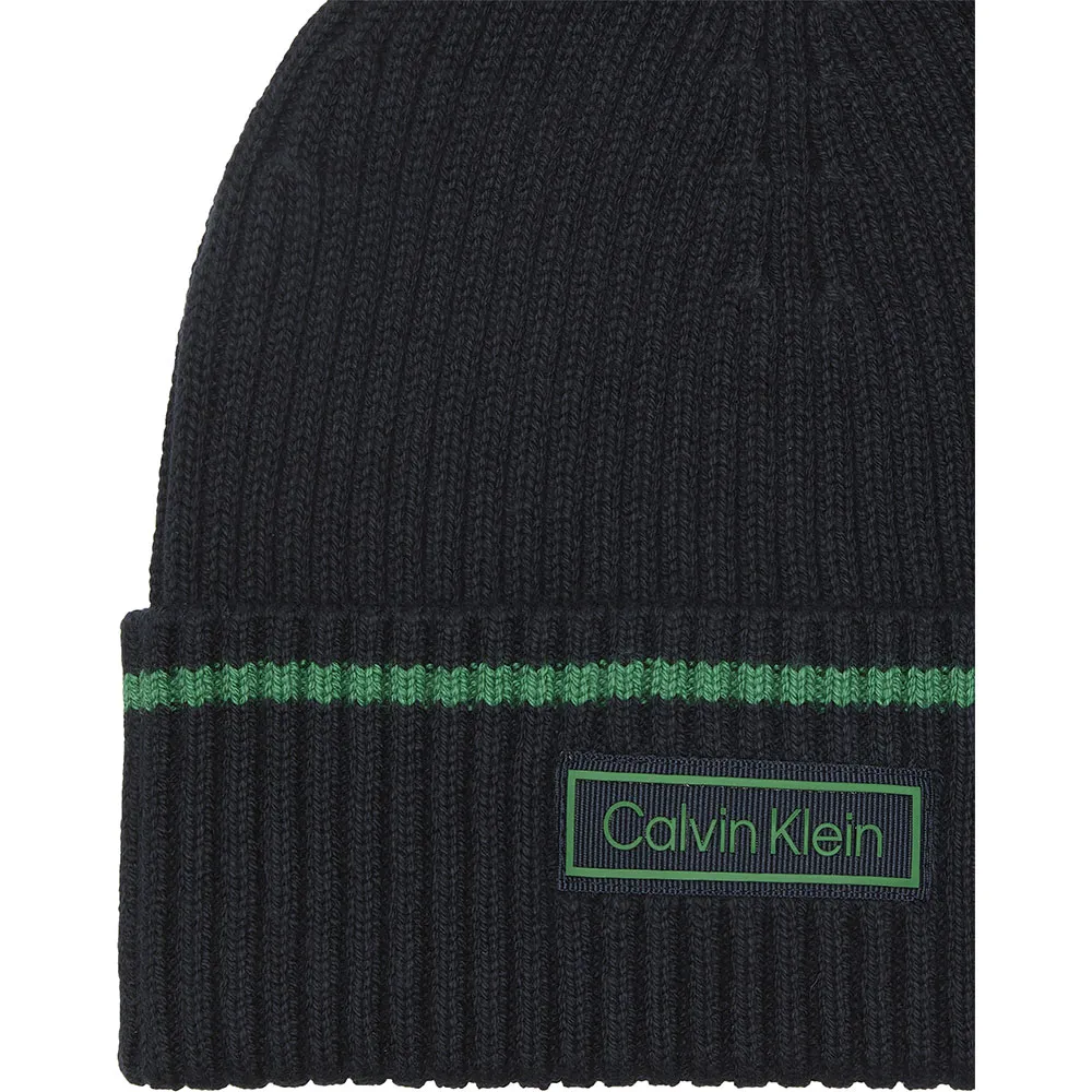 Musta hienoneulottu pipo vihreillä yksityiskohdilla ja yhteensopivalla kumipintaisella Calvin Klein -logolla.