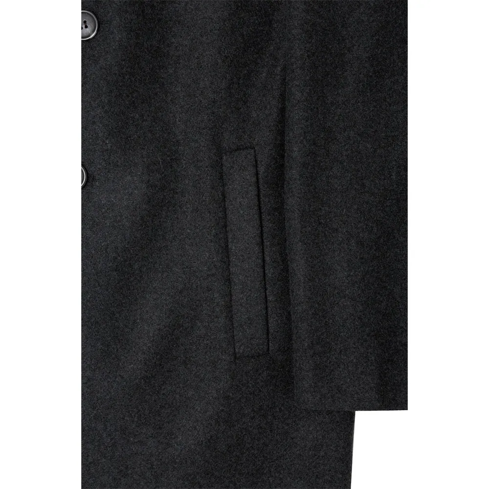 Manteau long à coupe classique, manches longues, fermeture boutonnée centrale et poches latérales.