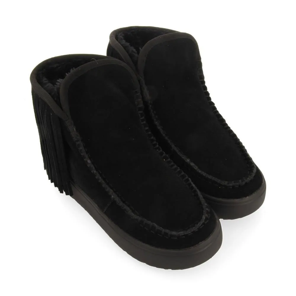 Bottes en cuir noir de style australien avec franges et doublure intérieure en fourrure.