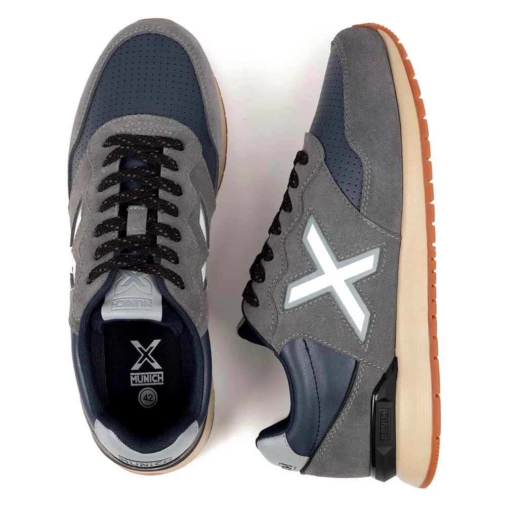 La tige est fabriquée à partir de matériaux synthétiques de haute qualité, choisis pour leur durabilité exceptionnelle, leur légèreté et leur facilité d´entretien. Ces matériaux avancés créent un ajustement structuré mais flexible, offrant un soutien fiable là où vous en avez le plus besoin. Les empiècements et superpositions complexes ajoutent non seulement à la profondeur visuelle de la chaussure, mais améliorent également son intégrité structurelle, garantissant qu´elle résiste aux exigences de la vie quotidienne. Le logo emblématique X de MUNICH est fièrement affiché sur le côté, un gage de qualité et de design européen authentique.