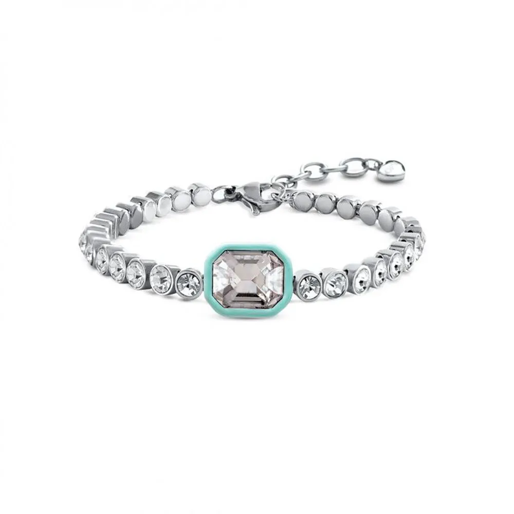 Le bracelet Wonder est magistralement conçu pour capturer et refléter la lumière sous tous les angles. Sa principale caractéristique est une pierre rectangulaire frappante, placée au centre, sertie dans un délicat cadre émaillé qui ajoute une subtile mais captivante touche de couleur. Ce point focal géométrique crée un look à la fois audacieux et gracieusement discret. La chaîne en acier poli du bracelet dégage une sensation élégante et moderne tout en offrant une durabilité remarquable pour un usage quotidien. Délicatement intercalés le long de la chaîne se trouvent des cristaux scintillants qui offrent un éclat continu et éblouissant, garantissant que votre poignet attire le regard à chaque mouvement.