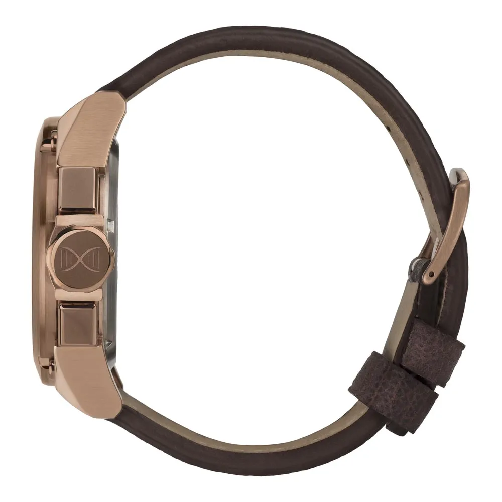 Bracelet en cuir, boîtier en acier inoxydable plaqué, verre minéral.