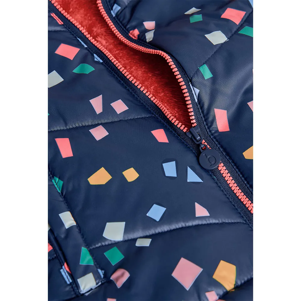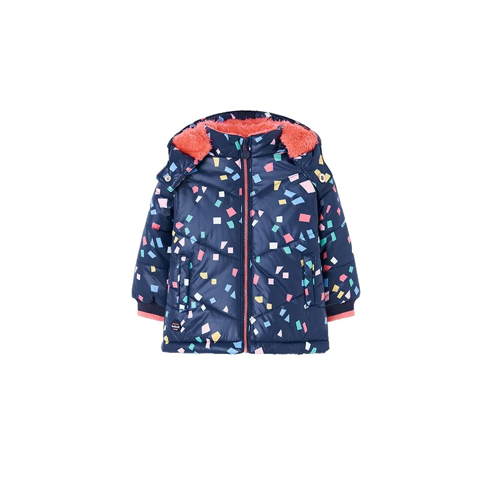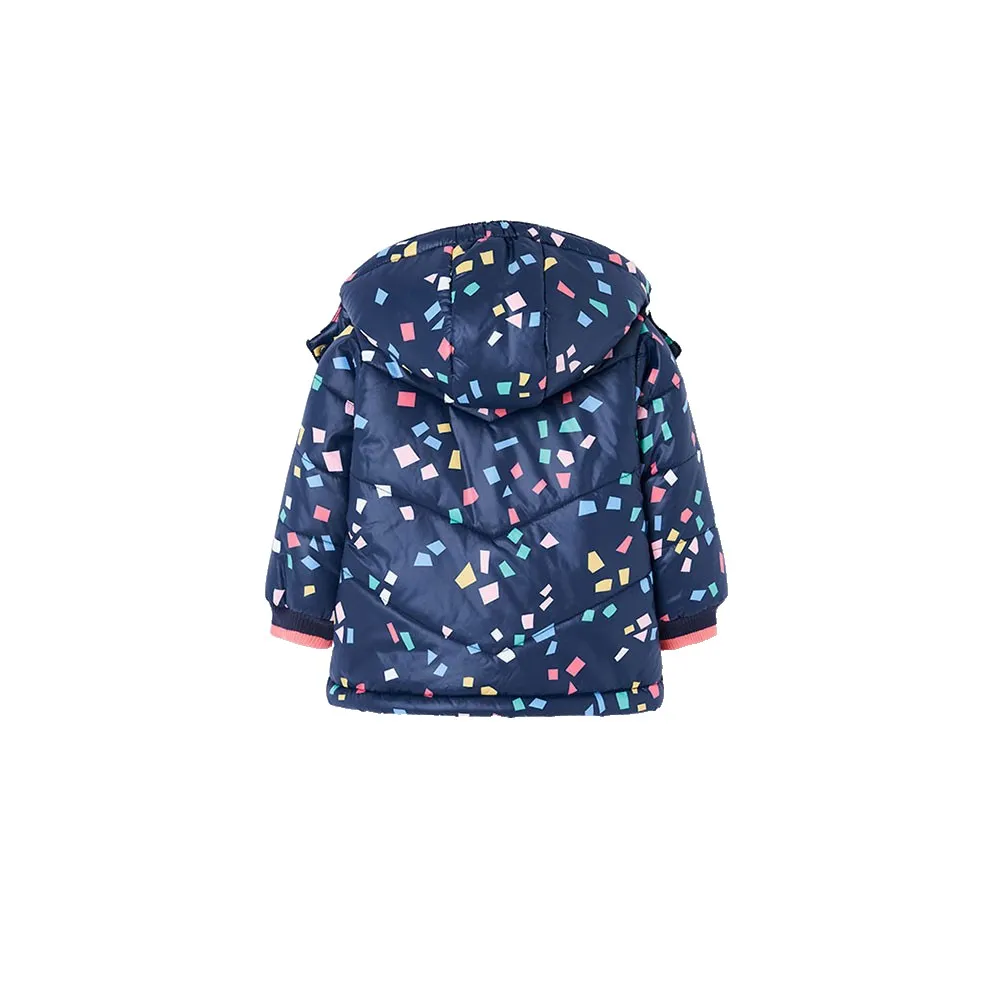 Parka in tessuto tecnico con motivo geometrico multicolore da bambina, ideale per la stagione invernale, che offre calore e uno stile moderno e allegro.
