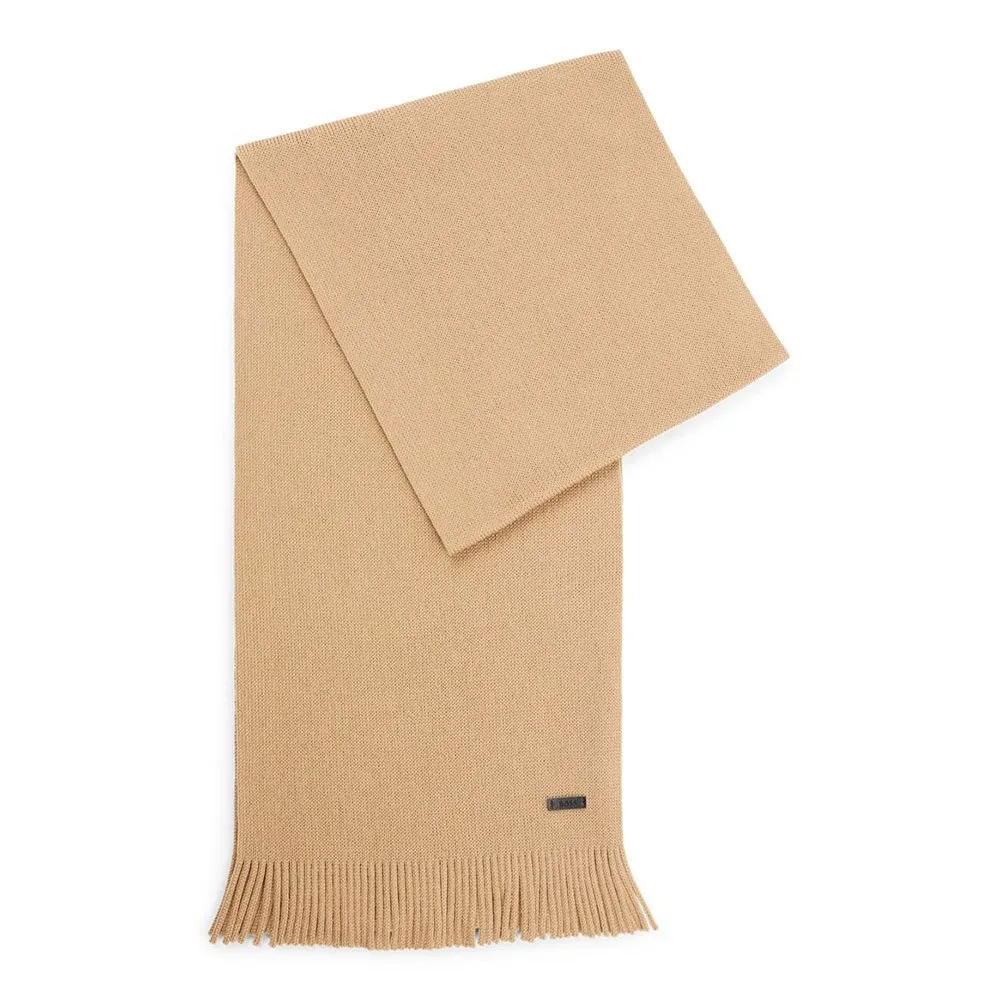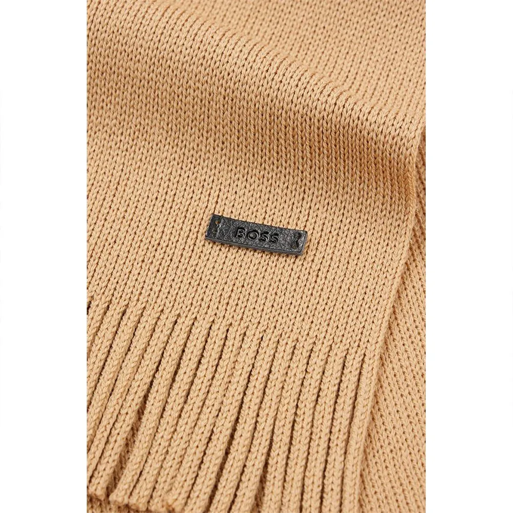 Il design è definito dalla sua costruzione raffinata e dal branding discreto. La sciarpa è creata utilizzando una maglia raschel di base, una tecnica specializzata che produce un tessuto stabile e strutturato con eccellente drappeggio e mantenimento della forma. Ciò garantisce che la tua sciarpa appaia impeccabile sia drappeggiata liberamente che annodata in un nodo classico. Aggiungendo un tocco di lusso moderno, il design è rifinito con una nuova placca logo in ecopelle. Questo dettaglio discreto ma distintivo funge da segno distintivo della qualità BOSS, offrendo un´alternativa sofisticata al tradizionale ricamo e consolidando lo status premium della sciarpa.