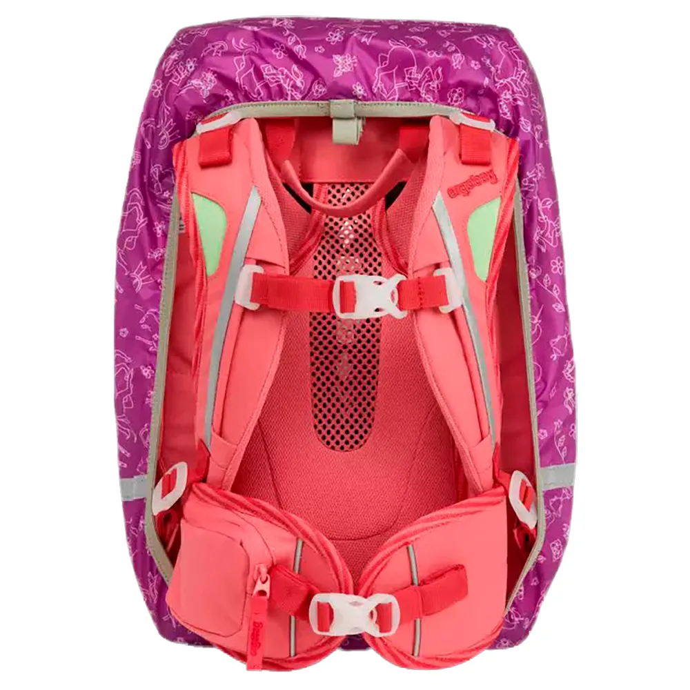 La mantellina antipioggia con superfici riflettenti offre una protezione aggiuntiva in caso di pioggia o al buio. Con stampe giocose o design fluorescente, si adatta a ogni ergobag e può essere facilmente riposta anche lì nel coprisacca e nel vano bagnato.