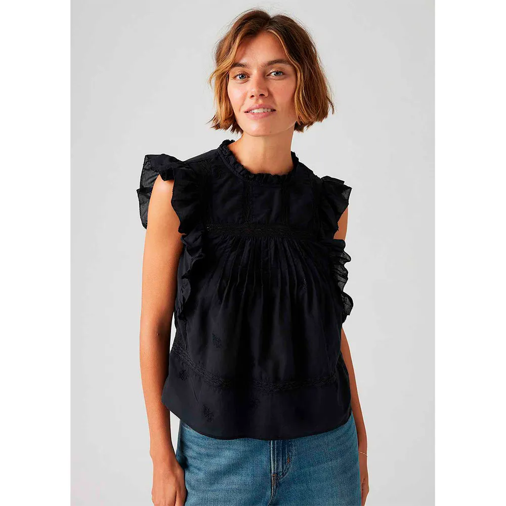 La nostra Edith Blouse presenta una scollatura alta, maniche a farfalla, una vestibilità fluida e dettagli floreali.