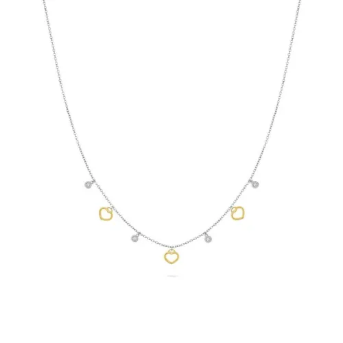 La vera bellezza di questa collana risiede nel suo design ponderato e dinamico. Come parte della collezione Twisted da donna di Opsobjects, incarna un tocco moderno su motivi classici. La base del pezzo è una catena splendidamente realizzata in acciaio resistente e lucido, che offre una brillante lucentezza dai toni freddi, sia resistente che ipoallergenica. Questa catena elegante funge da tela perfetta per i romantici punti focali della collana: una serie di delicati ciondoli a forma di cuore. Questi cuori sono rifiniti in un caldo tono oro giallo, creando uno straordinario e alla moda contrasto di metalli misti che cattura l´attenzione.