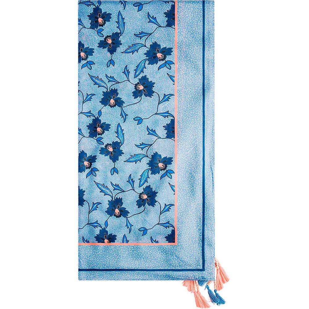 Morbida sciarpa con bordo a tinta unita e stampa floreale colorata, con dettagli di nappe e perline in legno.