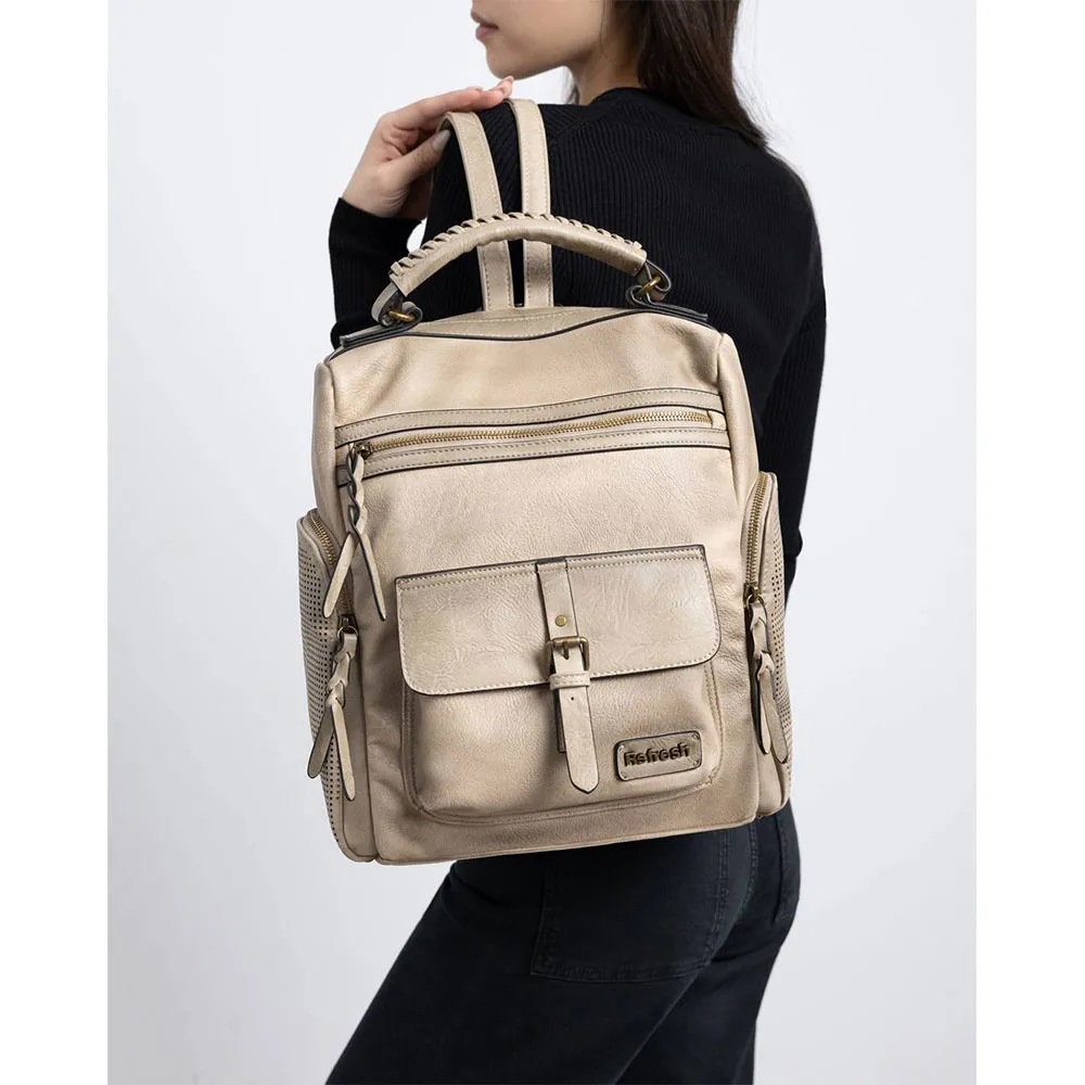 Zaino da donna di Refresh. Realizzato in ecopelle, offre una finitura moderna e resistente. La chiusura a zip garantisce la protezione dei tuoi effetti personali, mentre le tasche frontali e laterali aggiungono un tocco funzionale e di facile accesso. Misure: 36x31 x 14 cm. Questo modello è stato certificato vegano dall´organizzazione globale PETA .