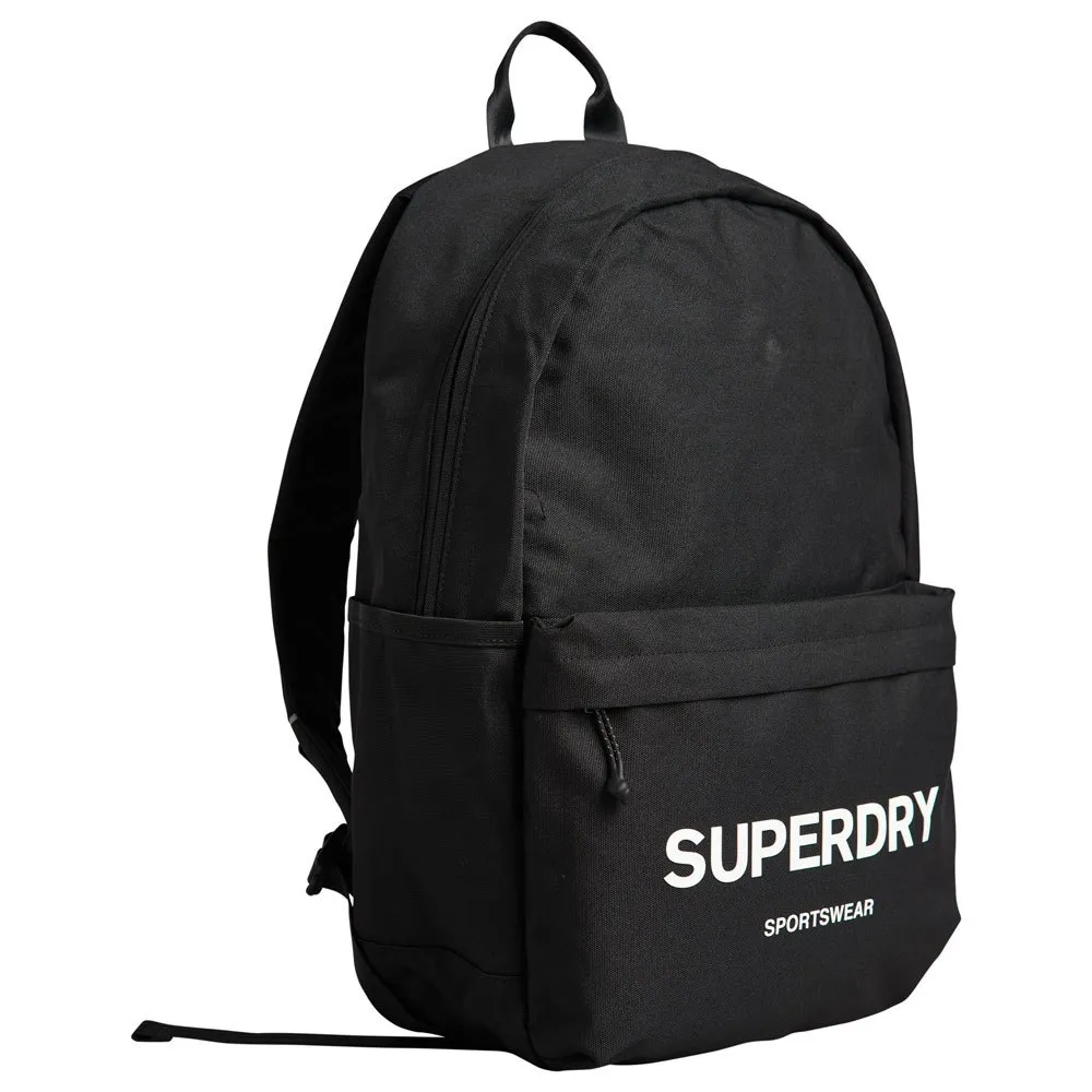 Design classico da escursionismo, Manico superiore, Scomparto principale con cerniera, Scomparto inferiore con cerniera, Due tasche laterali, Pannello posteriore imbottito e ventilato, Spallacci regolabili, Tasca interna imbottita per laptop (dimensione massima schermo 15''), Scomparto interno con cerniera, Marchio Superdry stampato , capacità 18 litri circa.