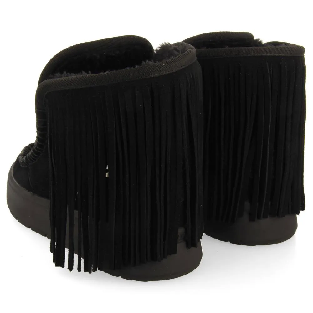 Zwarte leren laarzen in Australische stijl met franjes en een binnenvoering van bont.