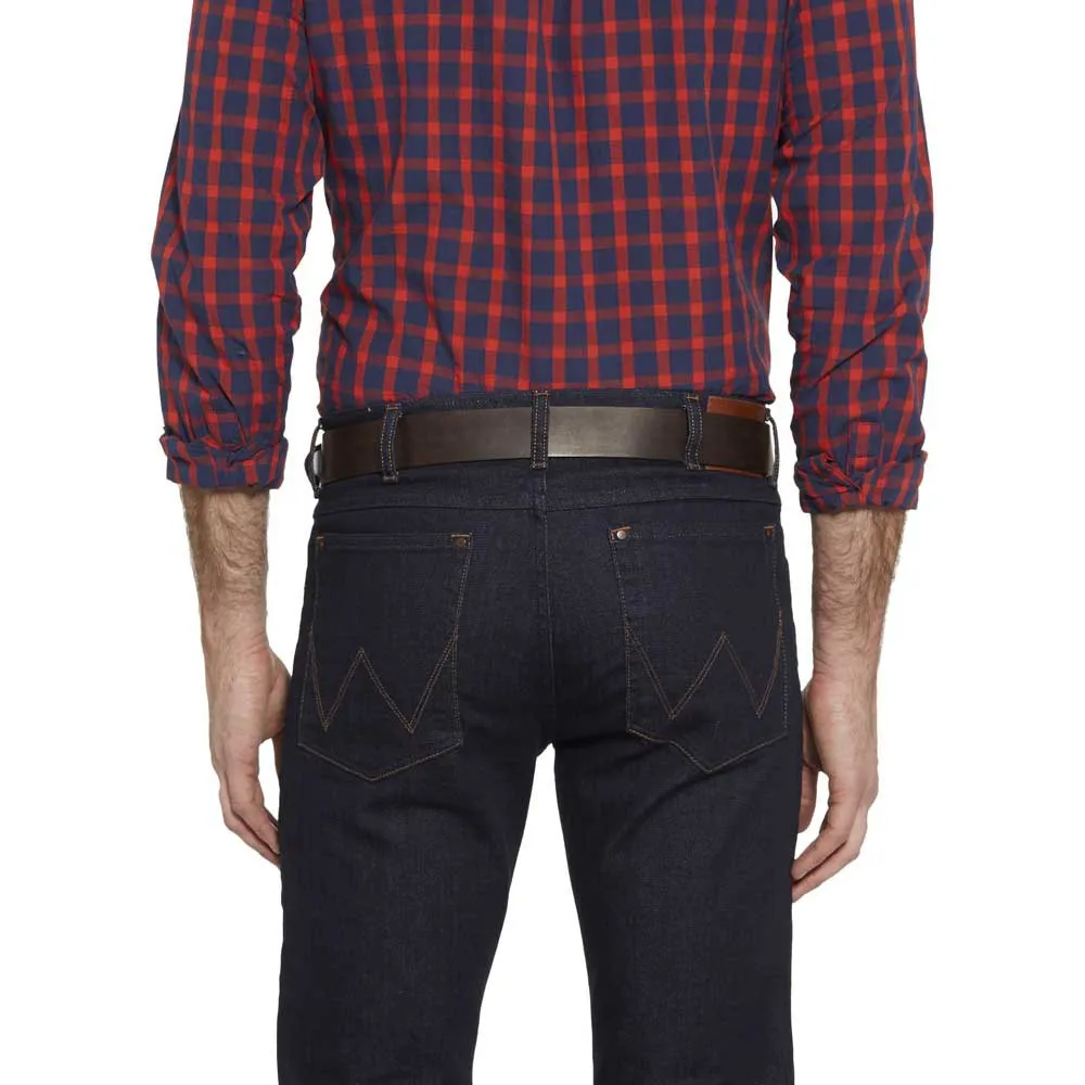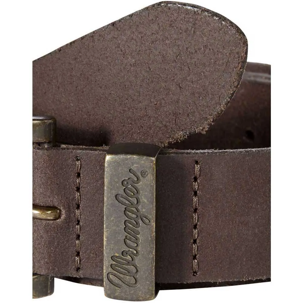Een klassieke donkerbruine lederen riem die bij je Wrangler-jeans past.