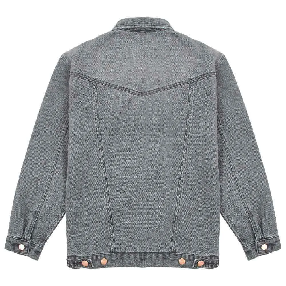 Ons Heritage-jack is geïnspireerd op een erfenis met een moderne twist en heeft een westernpuntige kraag en is afgewerkt met niet-rekbare grijze denim.