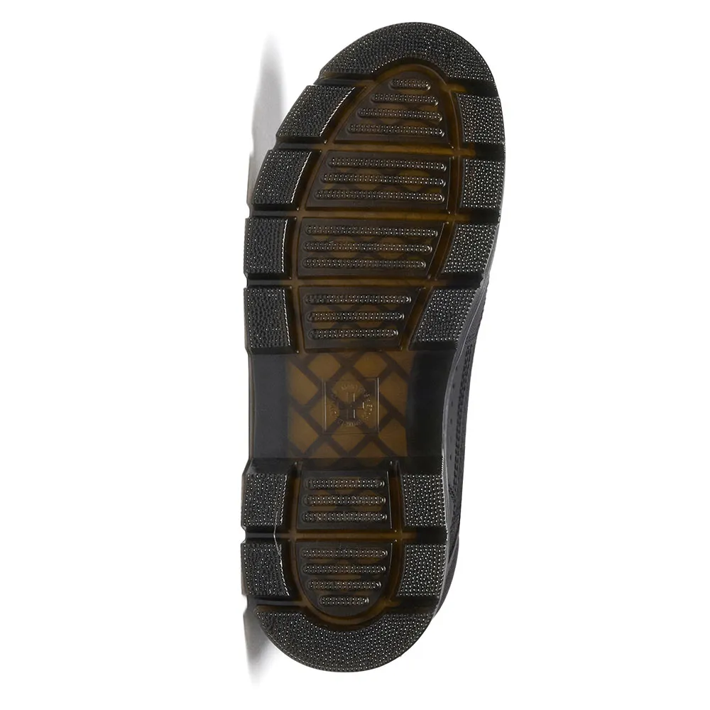 U podstaw Combs Tech Mk.02 leży potężna podeszwa Tract. Ta lekka, ale solidna podeszwa zewnętrzna została zaprojektowana z głębokimi, wytrzymałymi wgłębieniami, zapewniając doskonałą przyczepność i chwyt na zróżnicowanym terenie miejskim. Jest ona przymocowana do cholewki za pomocą naszej tradycyjnej konstrukcji Goodyear-welted, gdzie cholewka i podeszwa są zgrzewane na gorąco w temperaturze 700°C i wzmocnione naszym charakterystycznym żółtym szwem. Ta metoda jest złotym standardem trwałego obuwia, zapewniając, że Twoje buty są zbudowane tak, aby służyły przez wiele sezonów. Oczywiście żaden but Dr. Martens nie byłby kompletny bez podstawowego DNA, które definiuje markę od pokoleń. Znajdziesz kultowe rowkowane boki na podeszwie, widoczne żółte szwy i legendarną pętlę AirWair na pięcie, służącą jako dumny znak jakości i autentyczności.