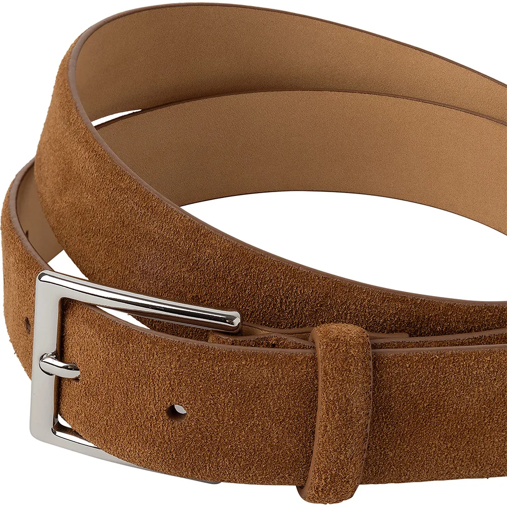 Cechą charakterystyczną tego wyjątkowego paska jest jego znakomita konstrukcja "feather-edge" (piórkowy brzeg). Ta drobiazgowa technika polega na zwężaniu krawędzi zamszu przed zszyciem, co skutkuje eleganckim, niepogrubiającym profilem, który gładko przylega do talii. Ta wyrafinowana sylwetka świadczy o dbałości o szczegóły i zapewnia czystą, dopracowaną linię, która podkreśla wygląd spodni lub chinosów. Główna część paska jest wykonana z luksusowego, aksamitnego zamszu, który nadaje bogaty, teksturowany wymiar każdemu strojowi, zapewniając wyrafinowany kontrast zarówno dla gładkiej bawełny, jak i wytrzymałego denimu.