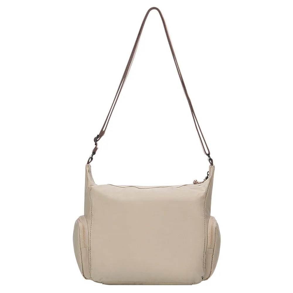 Wykonana z nylonu Crinkle, wytrzymałego i wodoodpornego materiału, posiada jedną komorę główną, dwie kieszenie boczne i jedną kieszeń przednią.