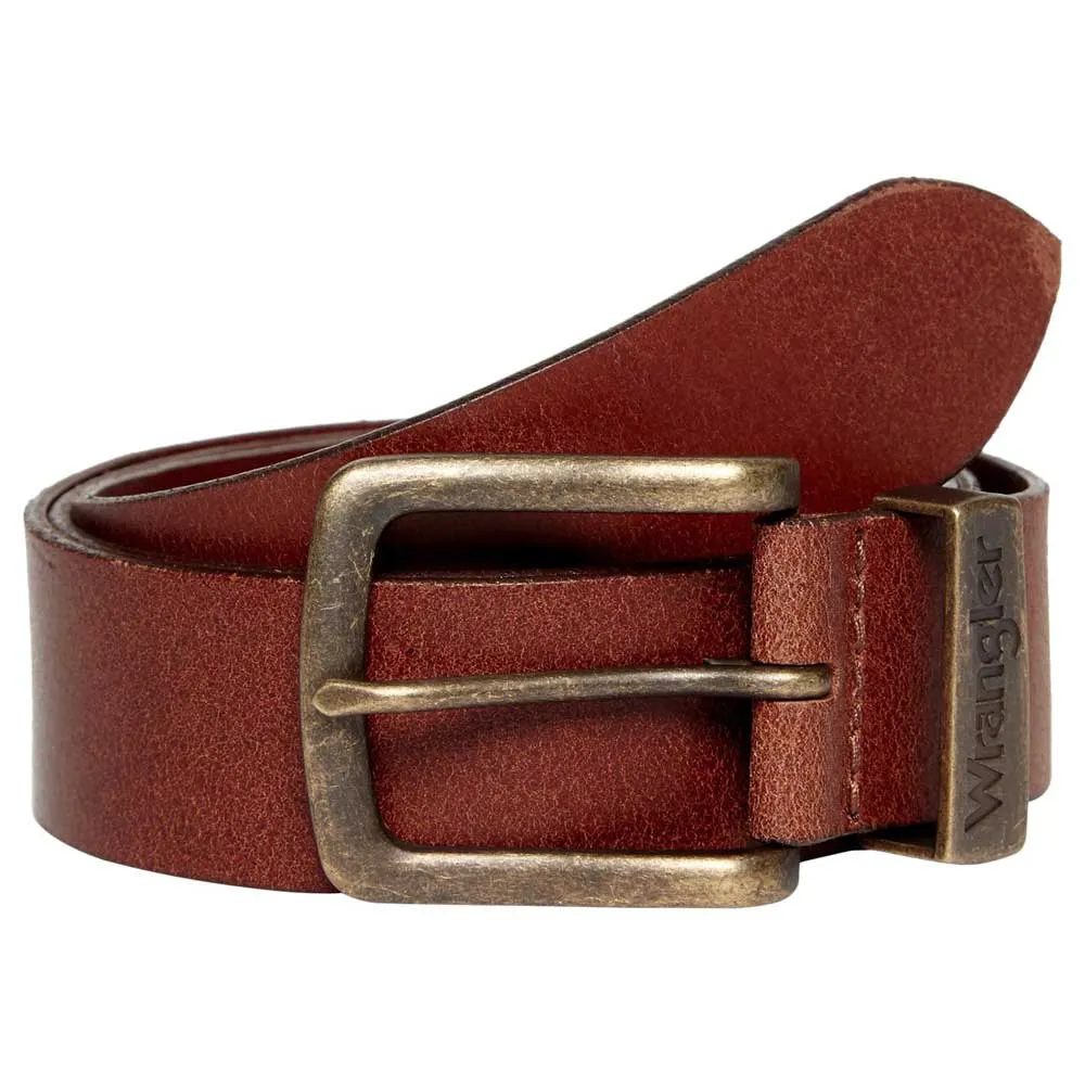 Klasyczny brązowy skórzany pasek w kolorze koniaku, pasujący do dżinsów Wrangler.