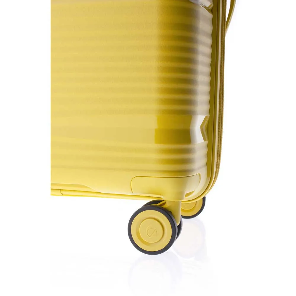 Quatro rodas duplas com detalhes na mesma cor da mala.