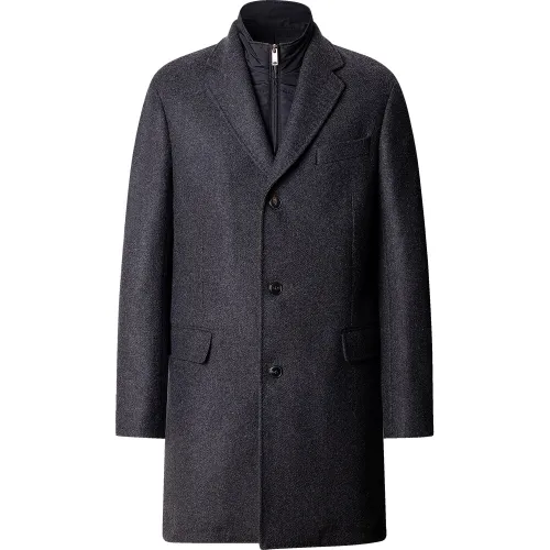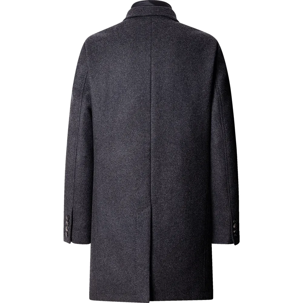 Apresenta um trespassado simples com lapela de entalhe, bolsos de aba e um peitilho acolchoado removível.