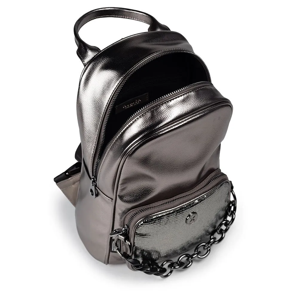 A mochila é feita com cuidado, usando materiais de alta qualidade que garantem durabilidade e longevidade. A cor prata adiciona um toque de elegância e sofisticação ao design geral, tornando-a um ótimo acessório para ocasiões casuais e formais.