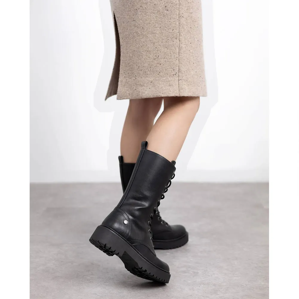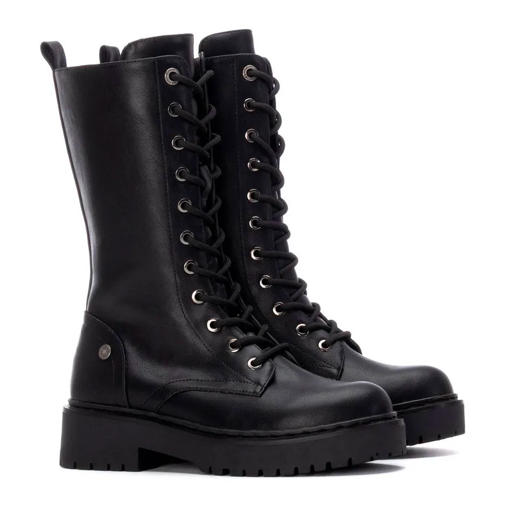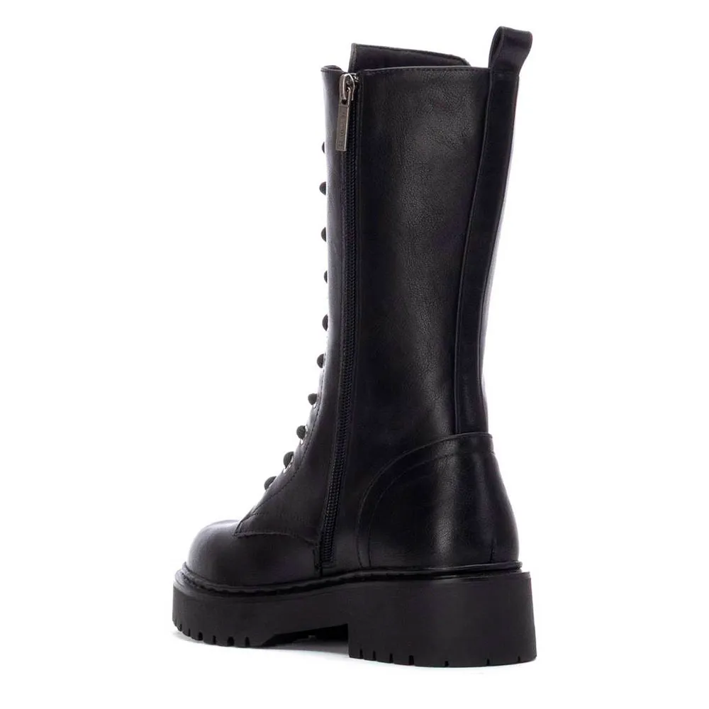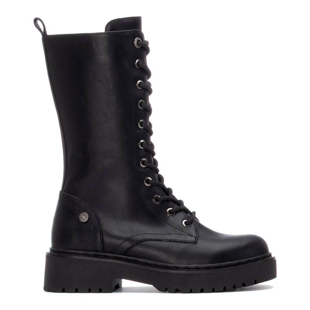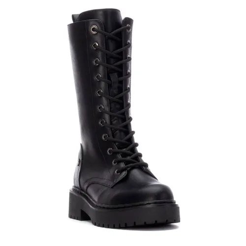 Bota feminina da Refresh. Feita de couro sintético com efeito réptil. Altura do cano de 23 cm. Fecho interior com zíper. Cordões ajustáveis. Puxador traseiro para facilitar o calçar e descalçar. Sola de borracha grossa. Com palmilha removível. Este modelo foi certificado como vegano pela organização global PETA .