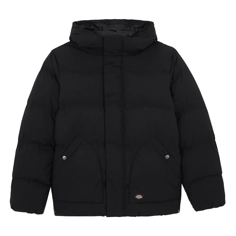 A regular fit winter jacket with a lightweight fabrication, featuring lofty synthetic down, heat sealed quilting, patch pockets, adjustable bottom hem, internal pocketing, full zip under placket with hidden snaps, and woven Dickies label.
