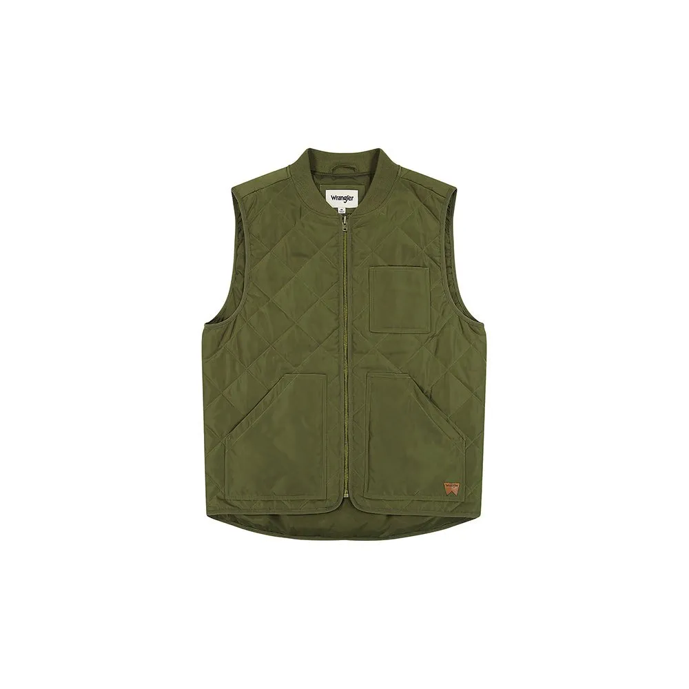 Den nedsänkta bakre fållen, det quiltade yttertyget och Wranglers signaturmärke ger denna väst en avslappnad look för enkel dagklädsel.