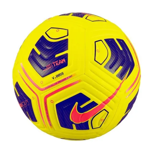 NIKE Academy fodboldbolden i gul/lilla/lysrød er et levende og iøjnefaldende stykke udstyr, der er specielt designet til træning og kampspil. Med en høj kvalitetskonstruktion med holdbare materialer giver denne bold enestående præstationer på banen.