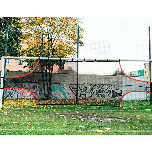 Net med grebssystem ved hjælp af elastikbånd til stolperne og overliggeren. Med pigge til placering i den (valgfrie) nederste del, til naturgræs. Fodboldmål. Dimensioner: 7,5x2,5m.
