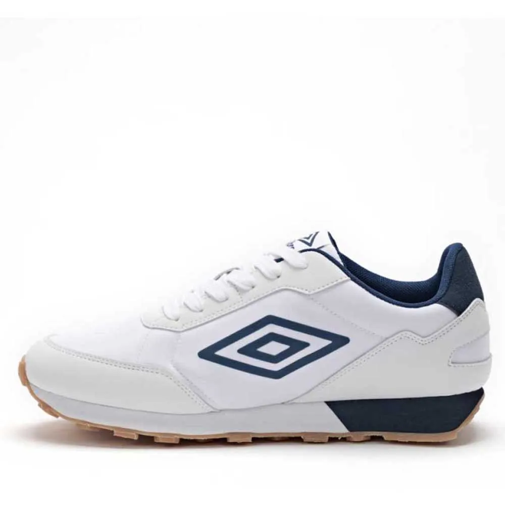 UMBRO Addison Trainers i hvid og mid navy er et stilfuldt og alsidigt par herresko. Disse sneakers har en ren hvid overdel med marineblå accenter på siderne og hælen. UMBRO-logoet er fremtrædende placeret på ydersiden af skoen for øget brandgenkendelse.
