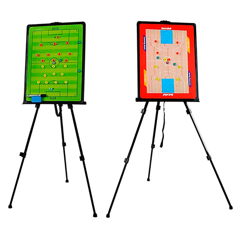 63.5x44cm großes Brett mit Fußballfeld auf der einen Seite und Basketballfeld auf der anderen Seite, inklusive Tasche für den Transport. Es enthält Chips (12+12+3), Marker, Radiergummi und Stativ mit teleskopischer Höhenverstellung von 50cm bis 120cm. Ideal für Trainingseinheiten und Taktikbesprechungen.