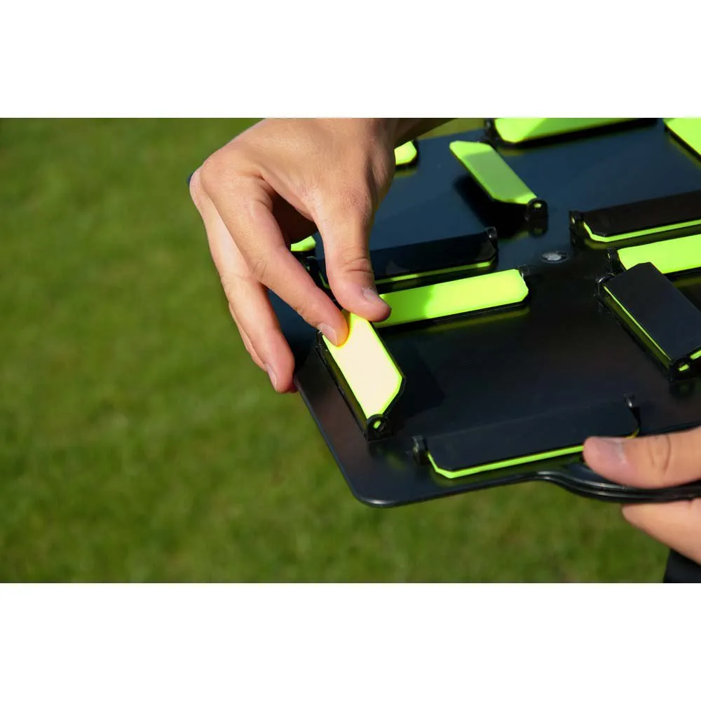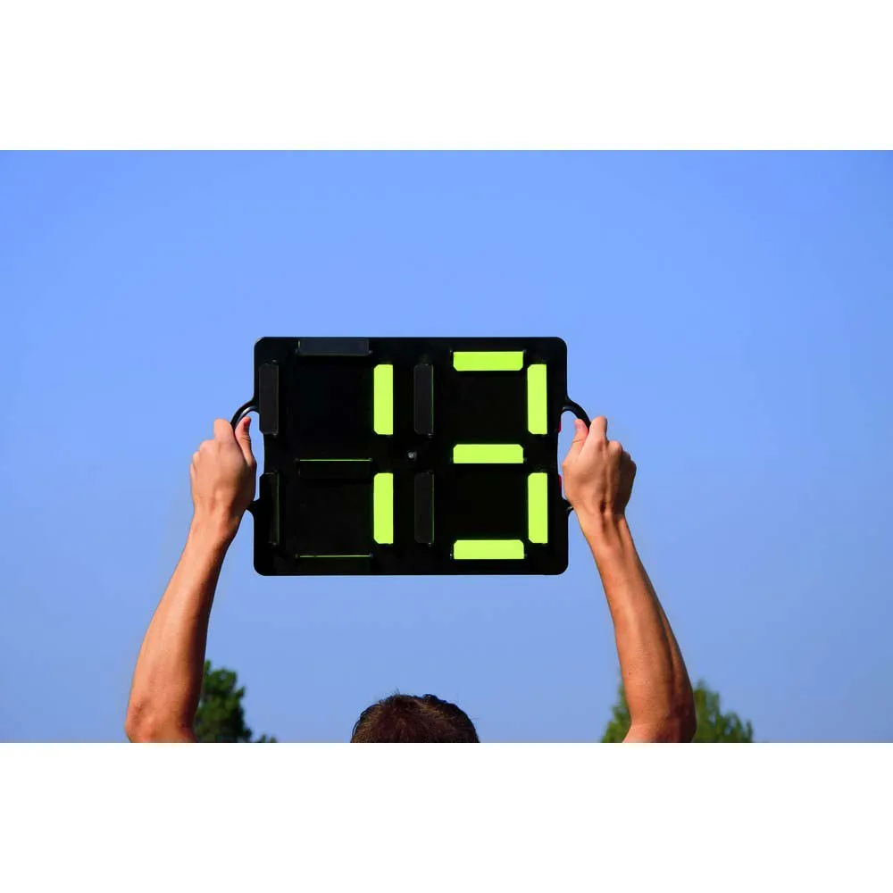 This substitution board facilitates swapping players quickly and easily! The double-sided subsitution board comes in yellow and orange with numbers from 1 to 99 and is extremely user-friendly. Change the numbers quickly by using the small shutters - black on one side and coloured on the other.