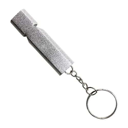 Whistle designed in flat format so that it occupies as little space as possible. Designed with hanging keychain.