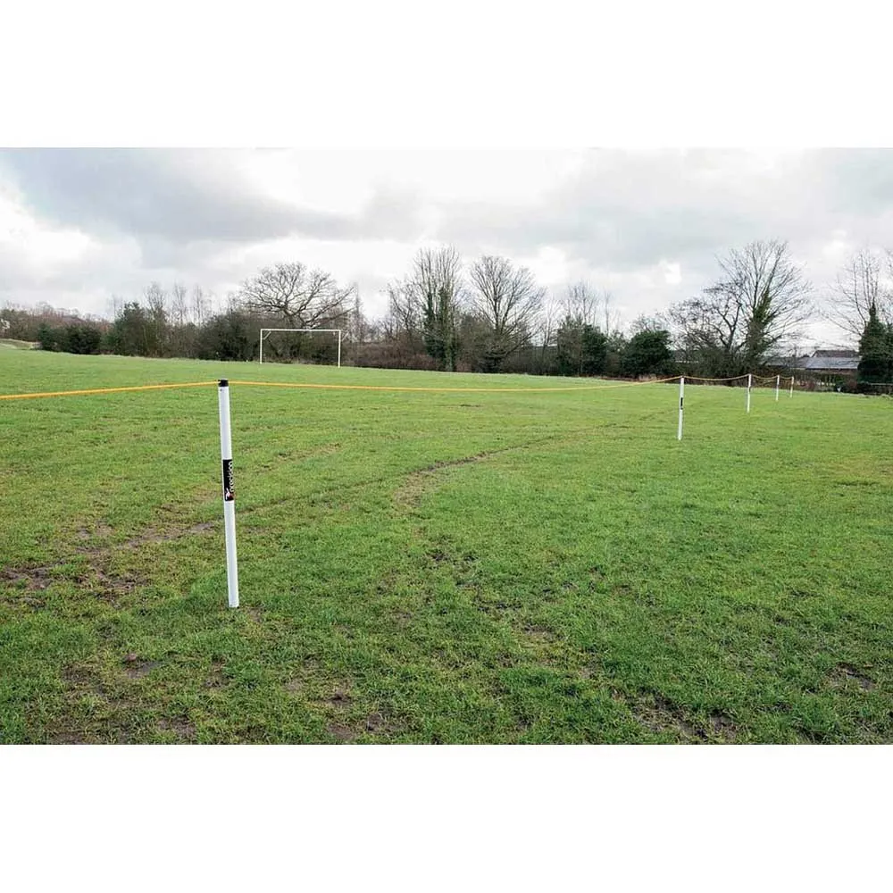 Cobertura Extensa: Con 60 metros de cuerda de alta visibilidad incluidos, este kit es capaz de cubrir toda la longitud de una línea lateral de campo estándar o acordonar un área designada grande, proporcionando una amplia cobertura para la mayoría de los deportes y eventos de base.