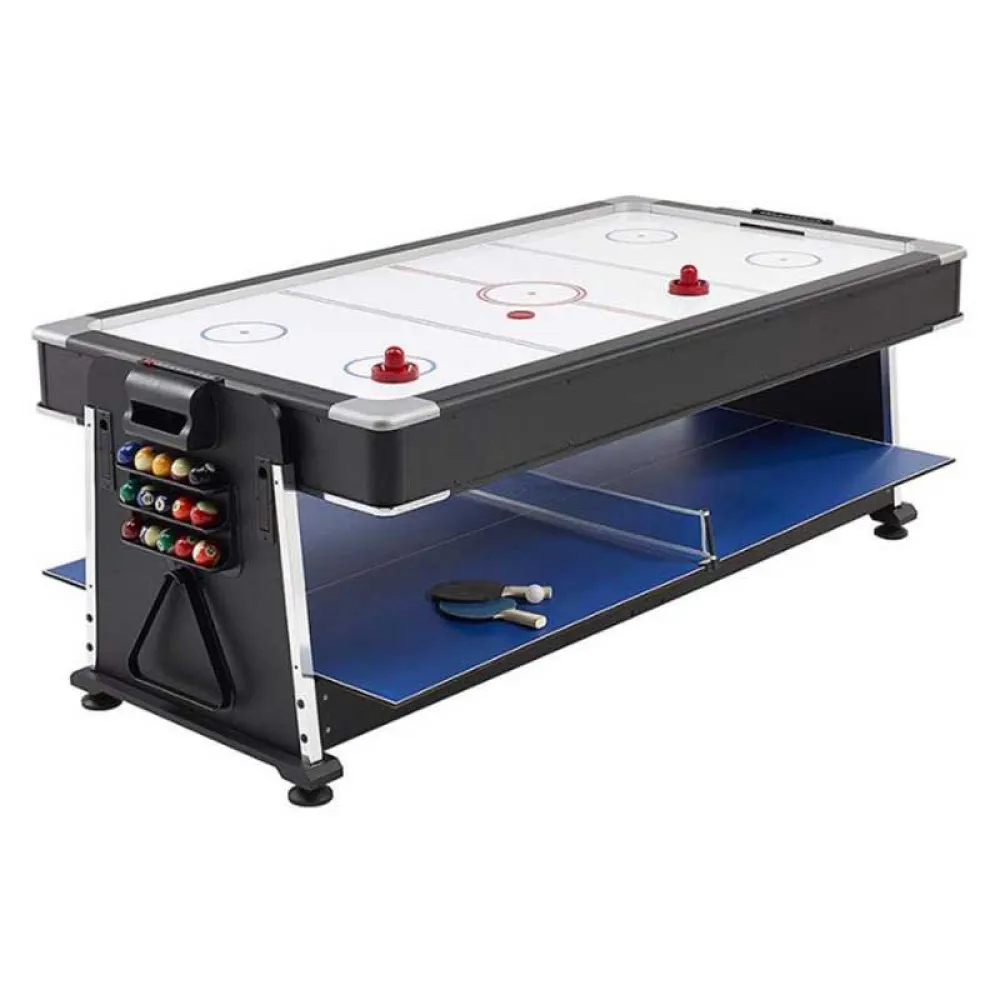 DEVESSPORT Multigames Tablen tärkeimpiä ominaisuuksia on sen kyky muuntautua erilaisiin peliasetuksiin. Se on varustettu vaihdettavilla pelilevyillä, joiden ansiosta voit vaivattomasti vaihtaa suosittujen pelien, kuten jalkapallon, ilmahokipöydän, pöytätenniksen ja biljardin välillä. Tämä monipuolisuus takaa, että jokaiselle löytyy jotakin, riippumatta hänen mieltymyksistään.