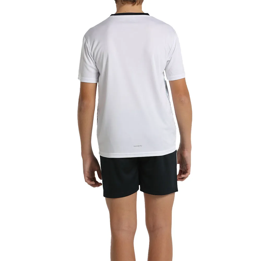 GUTTESETT MED T-SKJORTE I POLYESTER INTERLOCK, MED GRAFIKK FORAN OG KONTRASTFARGET KRAGE.