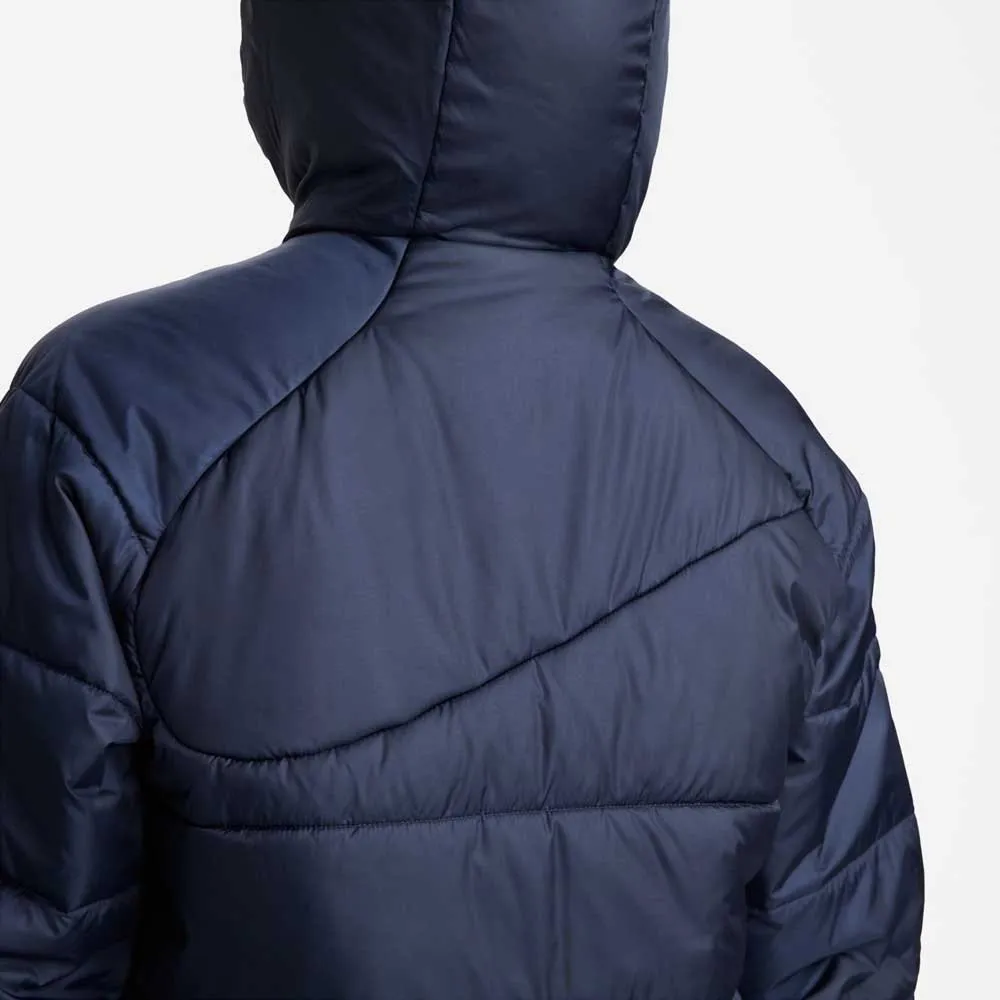 Jackan har en fullständig dragkedja framtill, en ståkrage och flera fickor för förvaring av det nödvändigaste. Nike swoosh-logotypen är tydligt placerad på bröstet för ökad igenkänning av varumärket.