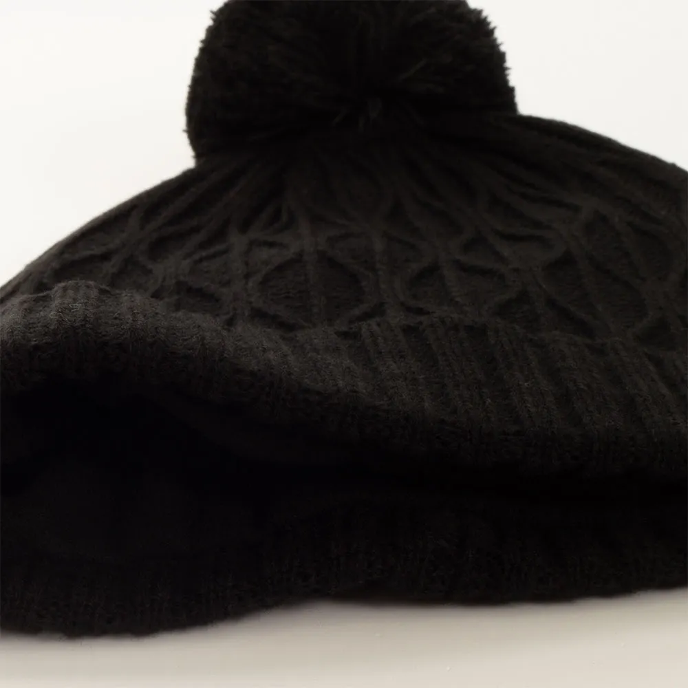 Die Marybeth Bommelmütze von Green Lamb zeigt ein auffälliges Gittermuster mit Rippstrickumschlag und wird diesen Winter das Sahnehäubchen für Ihren Look sein.