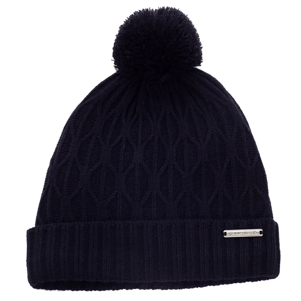 Die Marybeth Bommelmütze von Green Lamb zeigt ein auffälliges Gittermuster mit Rippstrickumschlag und wird diesen Winter das i-Tüpfelchen für Ihren Look sein.