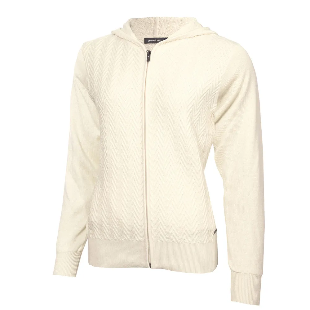 Full zip knitted cardigan with herringbone stitch pattern on the front and back.