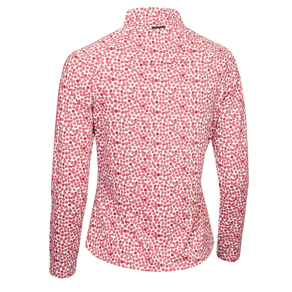 Printed, half zip performance top with solid contrast panel down sleeves.